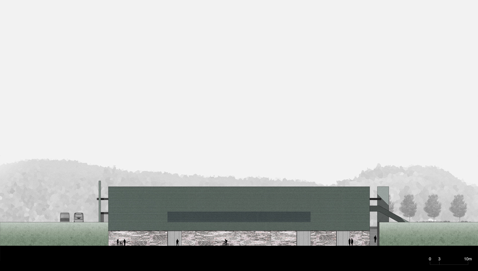 Il palazzetto dello sport è concepito come un’architettura duplice ovvero come un edificio che, seppure schiettamente contemporaneo, riserva una particolare attenzione alla contestualizzazione. Anche e soprattutto in virtù di alcune contraddizioni consapevoli volte a mitigare l’impatto paesaggistico di un’attrezzatura inevitabilmente rilevante dal punto di vista dimensionale. In tal senso, il palazzetto dello sport è previsto stereometrico, ma presenta un’altezza limitata, è previsto rivestito in lamiera metallica, ma è contrassegnato da cromatismi naturalistici (colore RAL 6005), è previsto monolitico, ma è disposto planimetricamente in modo tale da svolgere il ruolo di cerniera pedonale tra l’esistente centro sportivo “Magrelli Active” (in cui è previsto l’insediamento di un’ulteriore area a parcheggio), la pista ciclopedonale del fiume Corno e le aree di parcheggio ricavate al livello dell’ingresso del pubblico. Ma soprattutto, in virtù dei basamenti murari composti con le macerie prodotte dagli eventi sismici del 1979 e del 2016, il palazzetto dello sport, senza presumere di porsi in competizione né con i pinnacoli della basilica di Santa Rita, né con la statua presente sulla vicina rotatoria stradale, intende proporsi come landmark evocativo, capace di celebrare tanto la necessità del ricordo del passato quanto la necessità dell’aspirazione al futuro. Coerentemente con il suo carattere duplice, l’interno del palazzetto dello sport, contrapponendosi al carattere algido dell’esterno, si propone come un vero e proprio “scrigno ligneo”, composto da una teoria di essenze lignee a vista, volto a garantire un’atmosfera coinvolgente e rilassante.