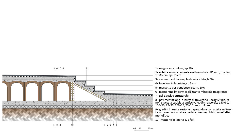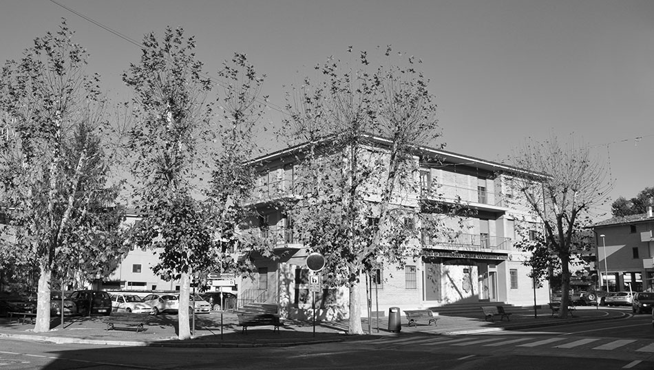 In tal senso, il progetto della nuova piazza (che è articolato in una parte pavimentata con lastre di pietra di travertino di Rapolano disposte “a correre” e in una parte sistemata in modo naturalistico previa piantumazione di cinque alberature della specie “laurus nobilis_alloro” e di un gruppo di roseti) prevede la riorganizzazione dei percorsi mediante la distribuzione strategica di un sistema di setti murari volti a individuare i percorsi pedonali che consentono l’accesso alla sede bancaria. Di questi, il setto murario rivolto verso via Leonardo da Vinci (la principale strada carrabile che perimetra la piazza) presenta in sequenza una seduta e una fontana contrassegnata dall’opera Lotta per la giustizia eseguita dallo scultore Marco Mariucci: quattro formelle in bronzo che “affrontano il tema delle ‘Virtù’, quale desiderio di recuperare un colloquio ormai sopito tra singolo e collettività ovvero tra abitante e realtà amministrative”.