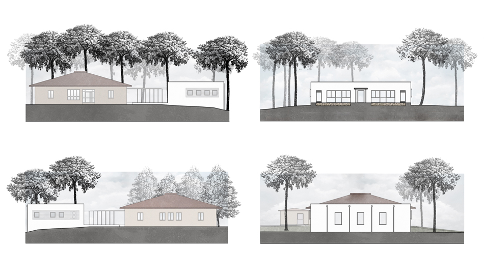 La nuova mensa scolastica, prevista come un corpo di fabbrica compatto a base rettangolare, prende come riferimento le dimensioni della scuola elementare esistente a cui si allinea idealmente, relazionandosi compositivamente come naturale estensione della scuola stessa. Il nuovo edificio si sviluppa su un solo livello e prevede una copertura piana su cui è adagiato il sistema dei pannelli fotovoltaici. I lati corti dell’edificio sono caratterizzati da bucature di piccole dimensioni, schermate da un pannello microforato in alluminio a sezione ondulata, che funge da frangisole. I lati lunghi, invece, sono caratterizzati in maniera antitetica da una parete muta sul lato verso sud e da grandi vetrate sul lato est, verso la scuola, per enfatizzare la relazione tra i due corpi di fabbrica, oltre che illuminare adeguatamente la sala refettorio con luce naturale e poter godere di uno spazio introspettivo e protetto come quello destinato agli orti didattici. L’edificio dall’esterno si presenta con tutte le facciate finite a intonaco e tinteggiate di colore bianco. Lo spazio che si genera tra i due corpi di fabbrica è pensato come un luogo che, nello svolgere la propria funzione di podio di collegamento tra l’edificio esistente e quello di progetto, si configura come occasione di sosta e di attività relazionali all’aperto, oltre che di attività laboratoriali attraverso la realizzazione di orti didattici.